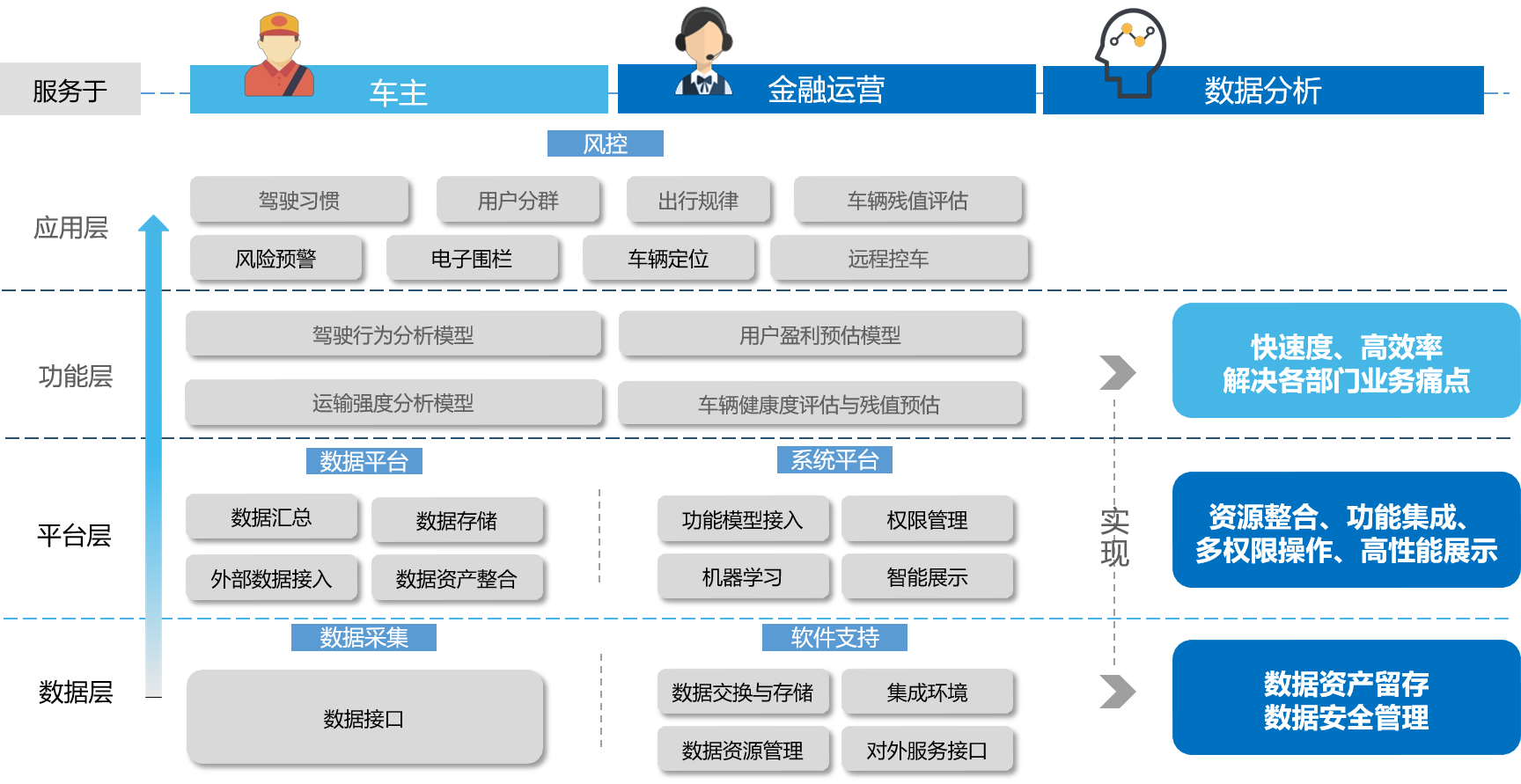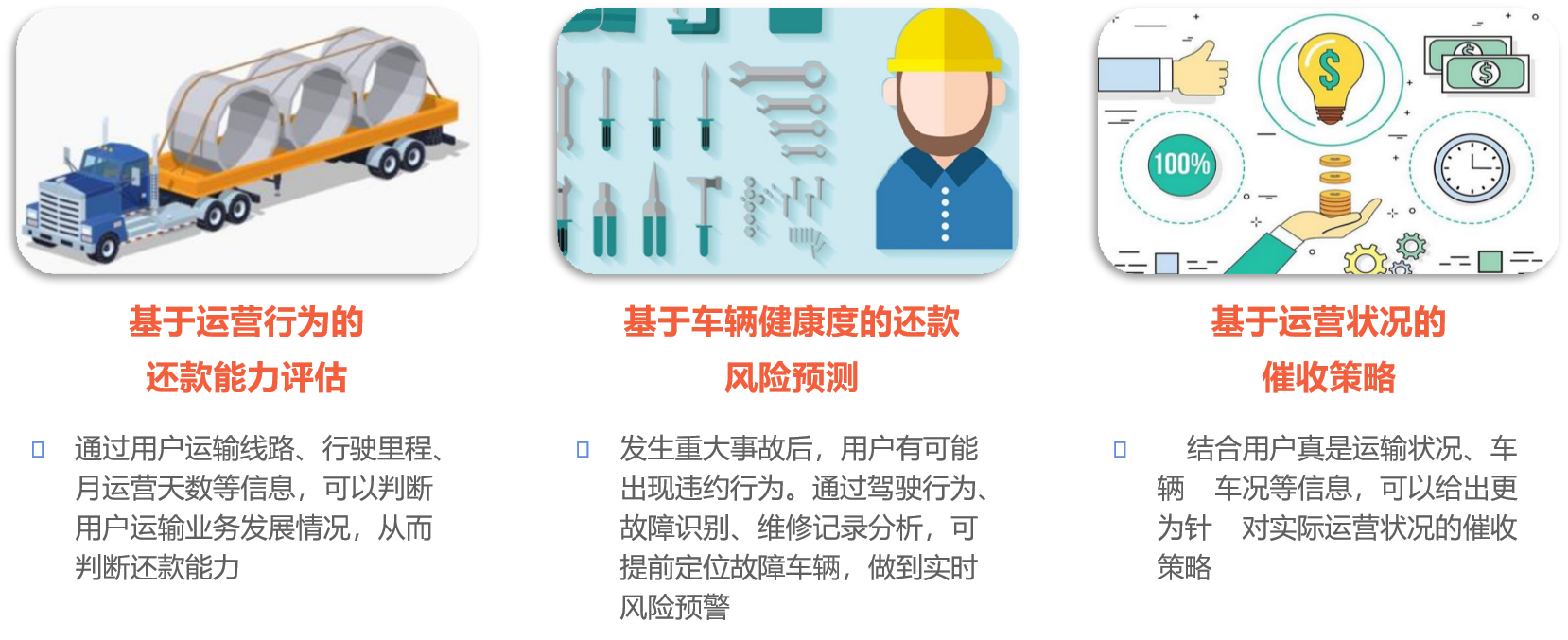 車聯(lián)網(wǎng)數(shù)據(jù)風(fēng)控方案,可以及時(shí)掌握用戶運(yùn)營(yíng)狀況、評(píng)估盈利與還款能力, 將傳統(tǒng)的違約后被動(dòng)催收轉(zhuǎn)變?yōu)檫€款前提前預(yù)警,催收工作更主動(dòng),風(fēng)險(xiǎn)更可控。