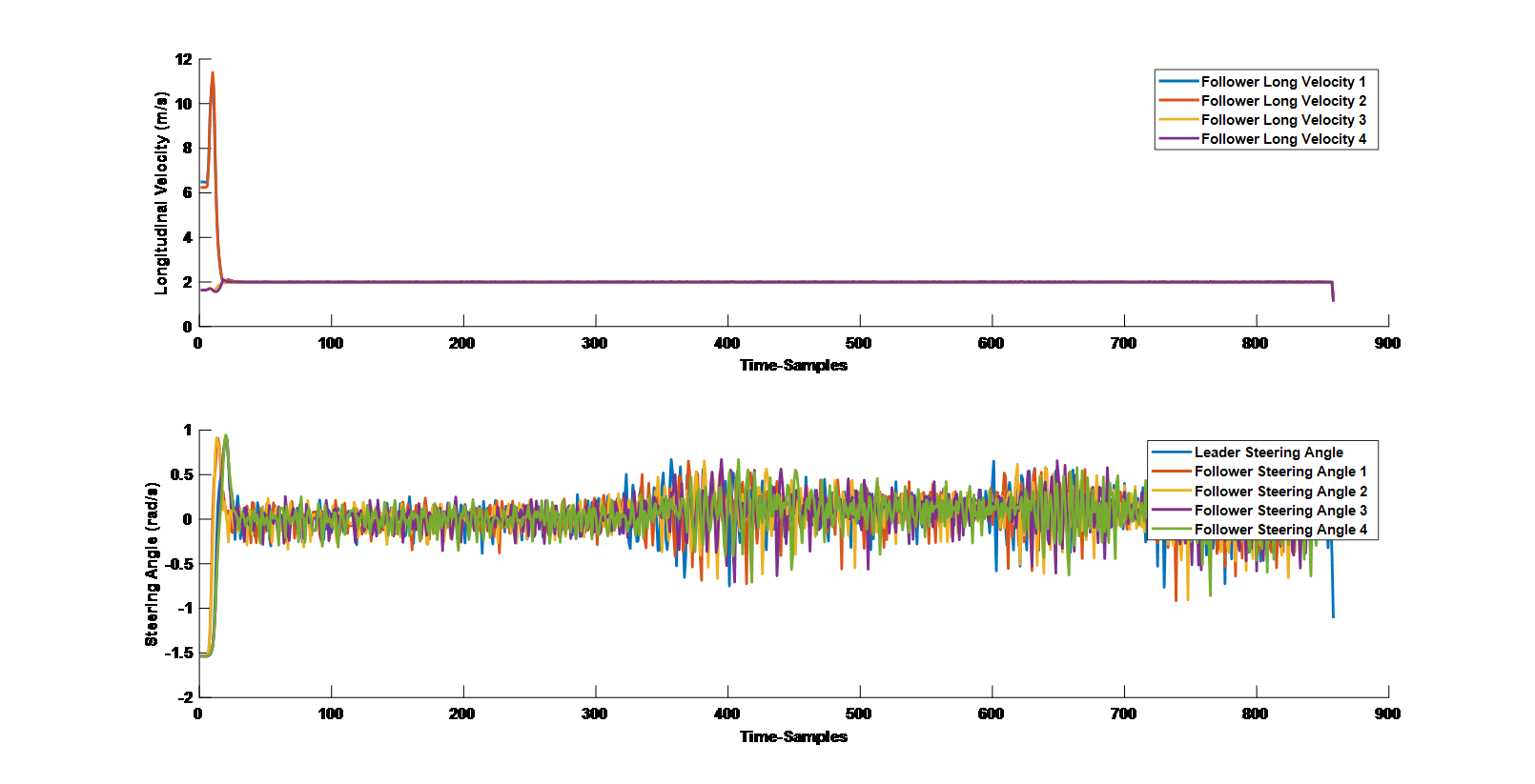 由模型的仿真結(jié)果可以看出,車(chē)隊(duì)中各個(gè)車(chē)輛的縱向速度、橫向方向盤(pán)轉(zhuǎn)角能夠保持比較好的一致性,路徑跟蹤也取得了比較好的效果,驗(yàn)證了本論文所提出的混合控制算法的有效性。