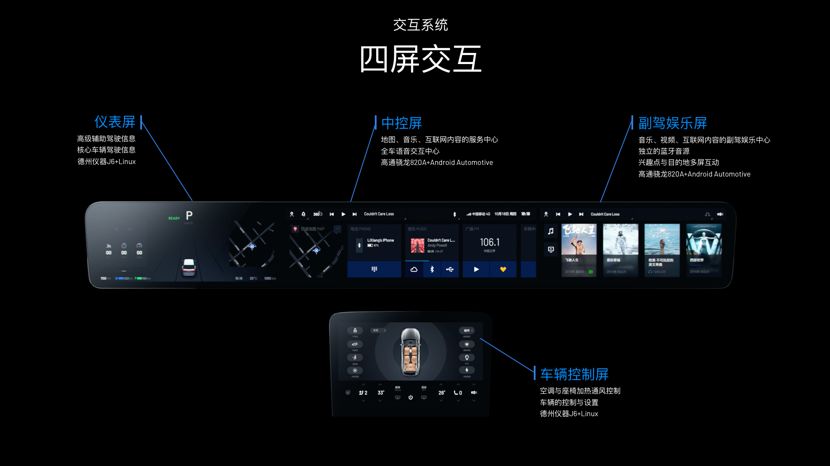 此外,范皓宇介紹,該系統(tǒng)的最大特點是通過四屏交互的方式將堆疊在一起的應(yīng)用拆分。駕駛員前方的儀表屏僅顯示車輛信息和ADAS,使駕駛員的注意力不被過度分散。副駕駛設(shè)置了專屬的娛樂屏,并有獨立的藍(lán)牙,與駕駛員互不干擾。另外兩塊屏幕分別是中控屏幕和車輛控制屏。中控屏主要用于集成應(yīng)用,而位于傳統(tǒng)空調(diào)控制區(qū)域的車輛控制屏單獨設(shè)立一塊屏幕,則是因為這是最用戶最高頻、剛需的功能,獨立屏幕可以讓用戶對空調(diào)的控制更加簡單、便捷。